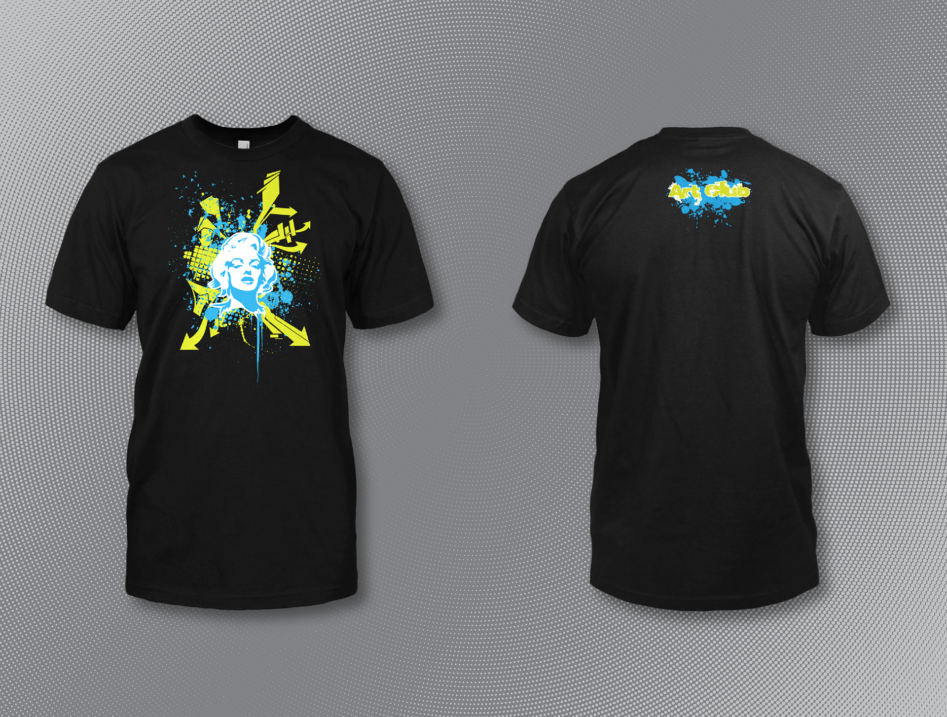 The centerpiece is a bold stencil of Marilyn Monroe, reimagined through spray-style splatters and layered halftones. Surrounding her are bursts of cyan and bright yellow-green arrows, a nod to the dynamic rhythm of graffiti composition, art that moves and points forward. The back keeps it simple with “Art Club” splashed across in the same expressive style.