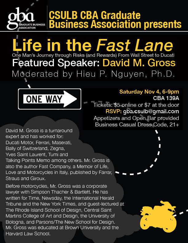 This project was created for my eldest sister, who needed help designing a flyer for a CSULB Graduate Business Association event featuring David M. Gross, author of Fast Company: A Memoir of Life, Love, and Motorcycles in Italy. Their original designer was unavailable due to finals, so I stepped in to create a clean, professional, and thematic layout on short notice.