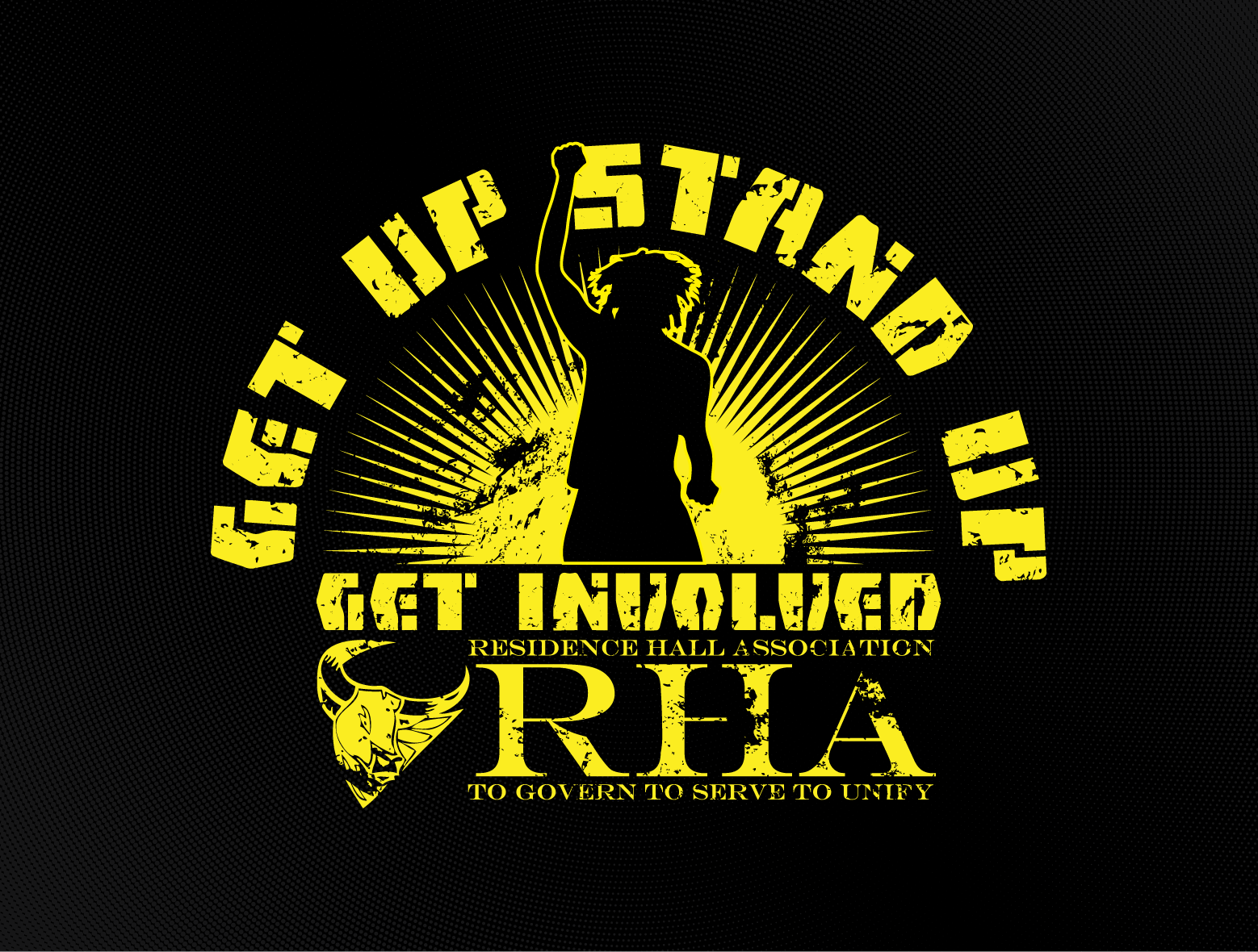 The design radiates energy through its use of bold yellow on a black tee, echoing revolution-style posters while keeping it approachable for campus wear. Rays of light burst outward from the central figure, representing inspiration and the ripple effect of action. The slogan “Get Up, Stand Up” crowns the composition, while “Get Involved – RHA” grounds it, turning the shirt into both a call to action and a badge of belonging.